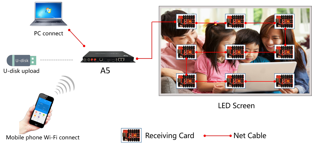 – Trình phát màn hình Led không đồng bộ: Loại HD-A5 có chức năng điều khiển lõi không đồng bộ, có 8GB bộ nhớ